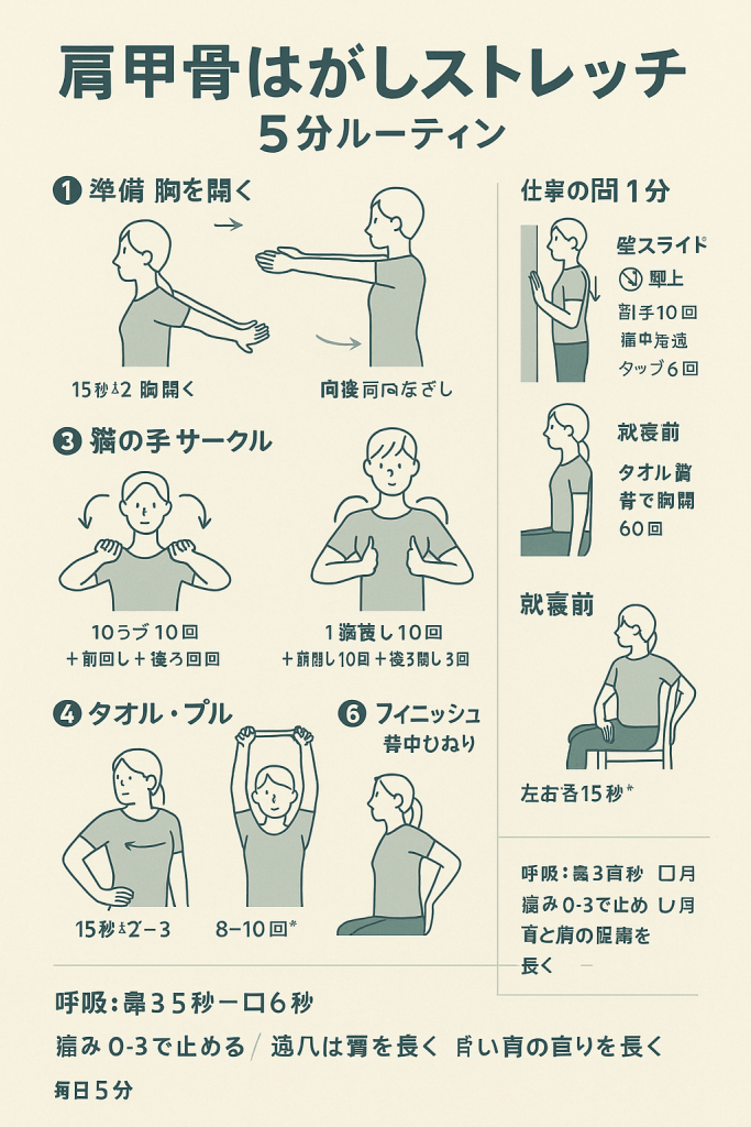 - 前屈:息を吐きながら上体を前に倒す(膝は曲げてOK)
